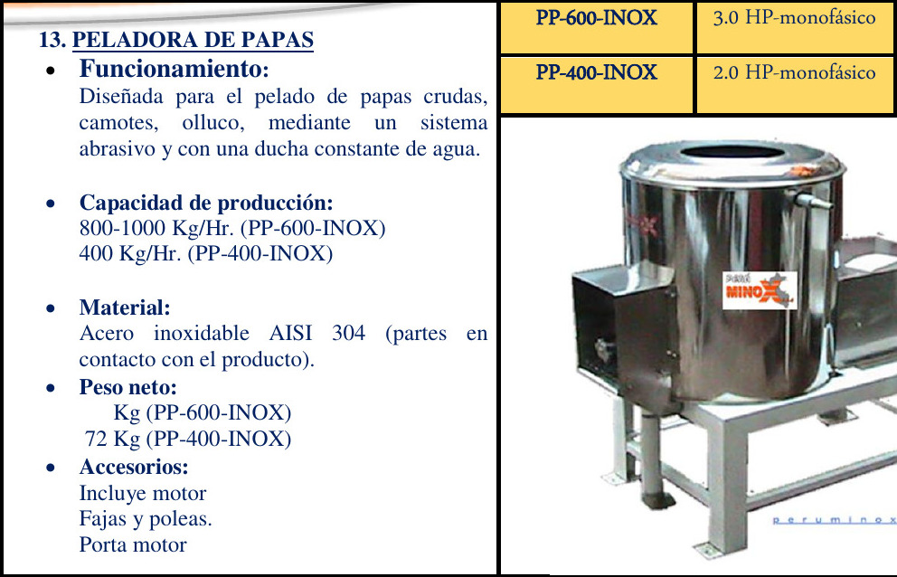 Diseñada para el pelado de papas crudas, camotes, olluco, mediante un sistema abrasivo y con una ducha constante de agua.