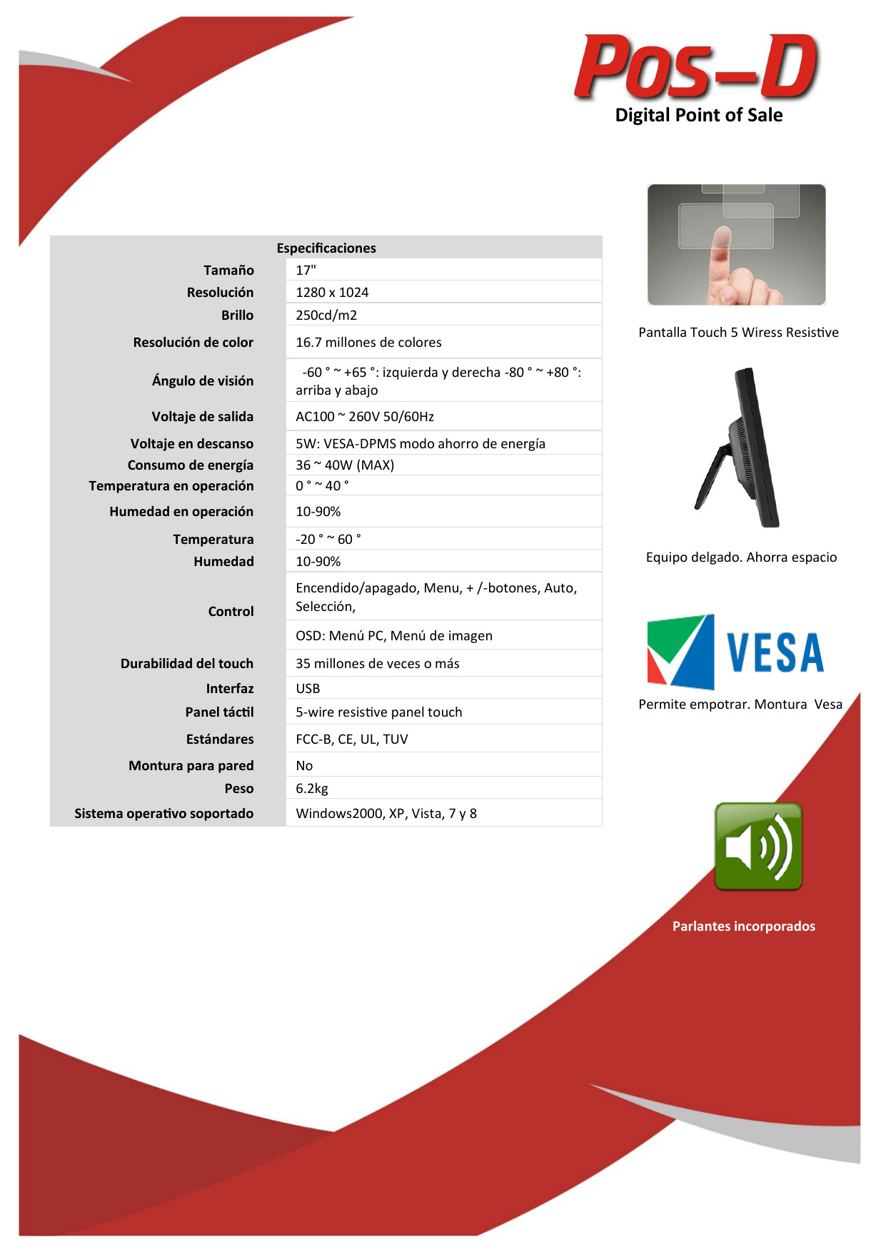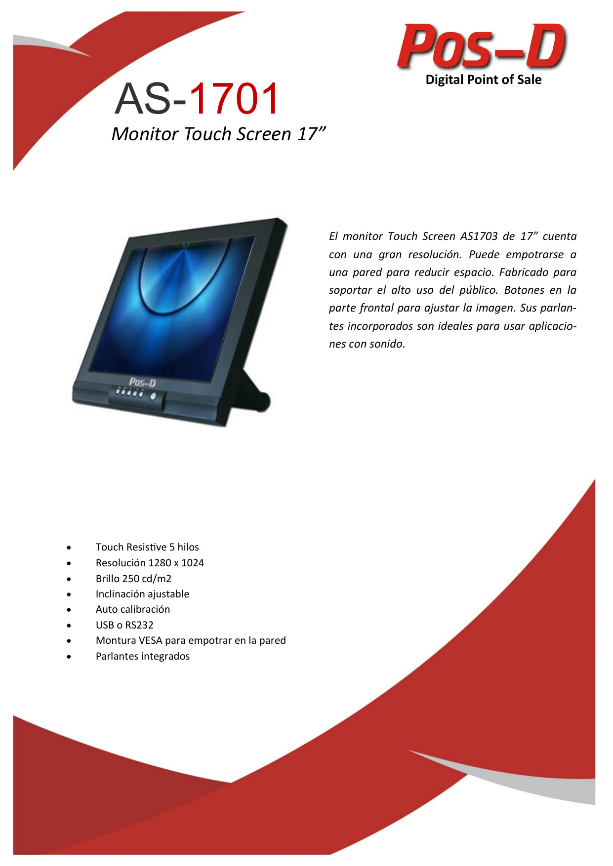 MONITOR TOUCH SCREEN – > MARCA: POS-D -> MODELO: AS1701 ; realizamos entrega en las ciudades de Lima, Arequipa, Cusco , Moquegua , Tacna , Ica , Chiclayo , Trujillo, Cajamarca, Piura, Tumbes, iquitos, Huancayo , Ayacucho , Pucallpa, Huanuco , Cerro de Pasco ; llevamos mas de 10 años comercializando POS-D en Peru , somos especialistas importando monitor touch screen, monitores , monitor tactil , monitor tactil 17″ MONITOR TOUCH SCREEN POS-D DE 17″, NEGRO, LCD, INCLUYE PARLANTES AS1701