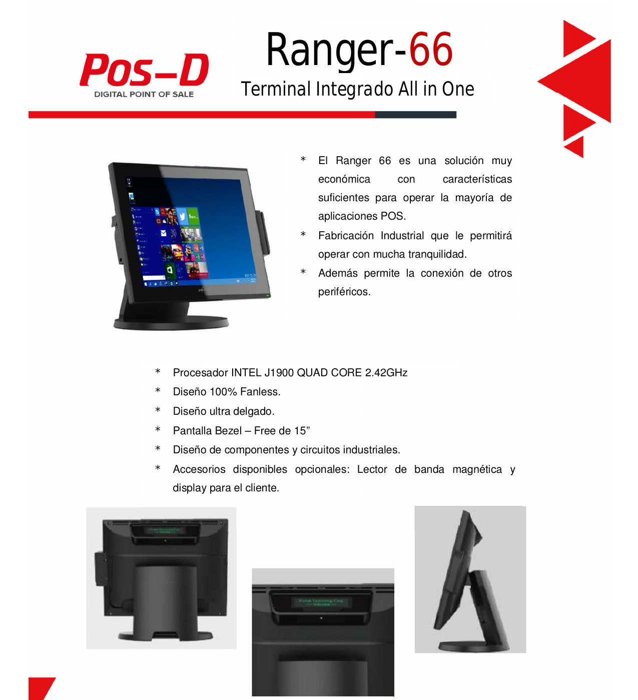 La Ranger 66 es sin duda el computador All In One mas vendido de la Industria de Puntos de Venta POS preparado para operaciones de largas jornadas de caja o ingreso de datos (comandas); su versatilidad y diseño le permite amoldarse a cualquier entorno y terreno. Su capacidad de procesador, su almacenamiento (puede pedirla con disco duro o con memoria SSD) y su memoria ampliada hace que sea la mas indicada para funcionar con cualquier software POS. A todas estas ventajas se suman 2 años de garantía por el fabricante.