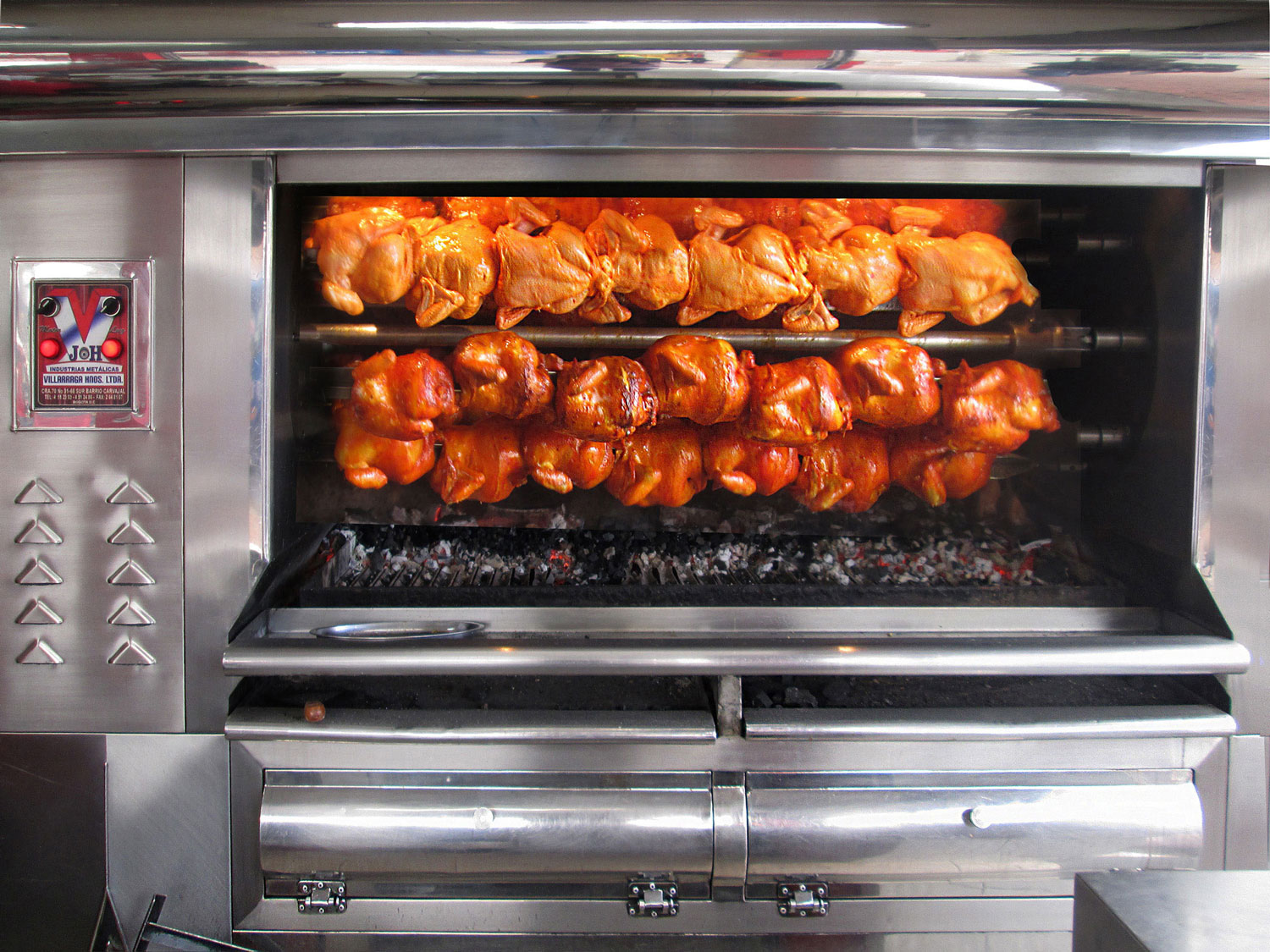 Conservando el tradicional asado a las brasas, presentamos esta excelente opción. Nuestro horno a carbón está fabricado en acero inoxidable, cuenta con un sistema mecánico de rotación y traslación para el asado homogéneo del producto.