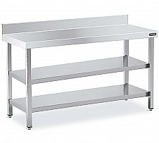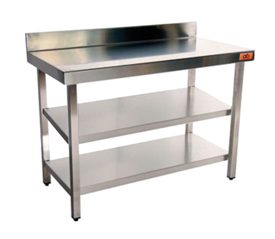 Mesa de trabajo de acero inoxidable con respaldo con 2 niveles de alta estabilidad y robustez.