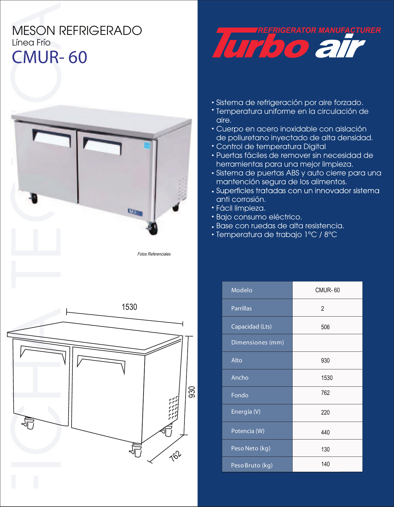 MESA REFRIGERADA – > MARCA: TURBO AIR -> MODELO: CMUR-60 ; realizamos entrega en las ciudades de Lima, Arequipa, Cusco , Moquegua , Tacna , Ica , Chiclayo , Trujillo, Cajamarca, Piura, Tumbes, iquitos, Huancayo , Ayacucho , Pucallpa, Huanuco , Cerro de Pasco ; llevamos mas de 10 años comercializando TURBO AIR en Peru , somos especialistas importando mesa refrigerada , linea frio , refrigerador bajo el mostrador, mesa refrigerada de 2 puertas MESA REFRIGERADA 2 PUERTAS. SIN RESPALDO. CON RUEDAS TURBO AIR CMUR-48