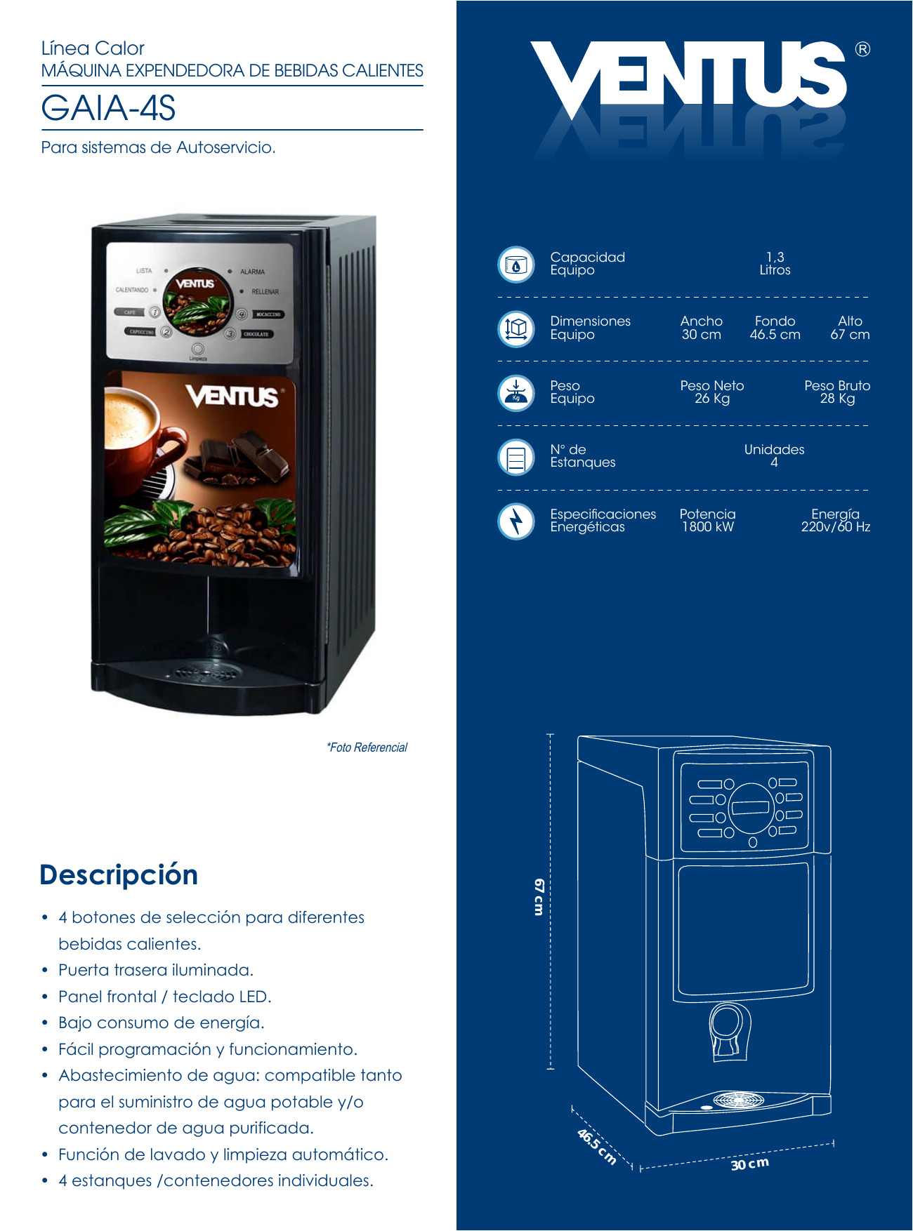 MAQUINA DISPENSADORA DE BEBIDAS CALIENTES – > MARCA: VENTUS -> MODELO: GAIA 4S ; realizamos entrega en las ciudades de Lima, Arequipa, Cusco , Moquegua , Tacna , Ica , Chiclayo , Trujillo, Cajamarca, Piura, Tumbes, iquitos, Huancayo , Ayacucho , Pucallpa, Huanuco , Cerro de Pasco ; llevamos mas de 10 años comercializando VENTUS en Peru , somos especialistas importando maquina dispensadora de bebidas calientes, linea calor , maquina dispensadora de bebidas calientes de 1.3 litros, maquina dispensadora de bebidas calientes de 4 estanquesMaquina expendedora de bebidas calientes GAIA 4S