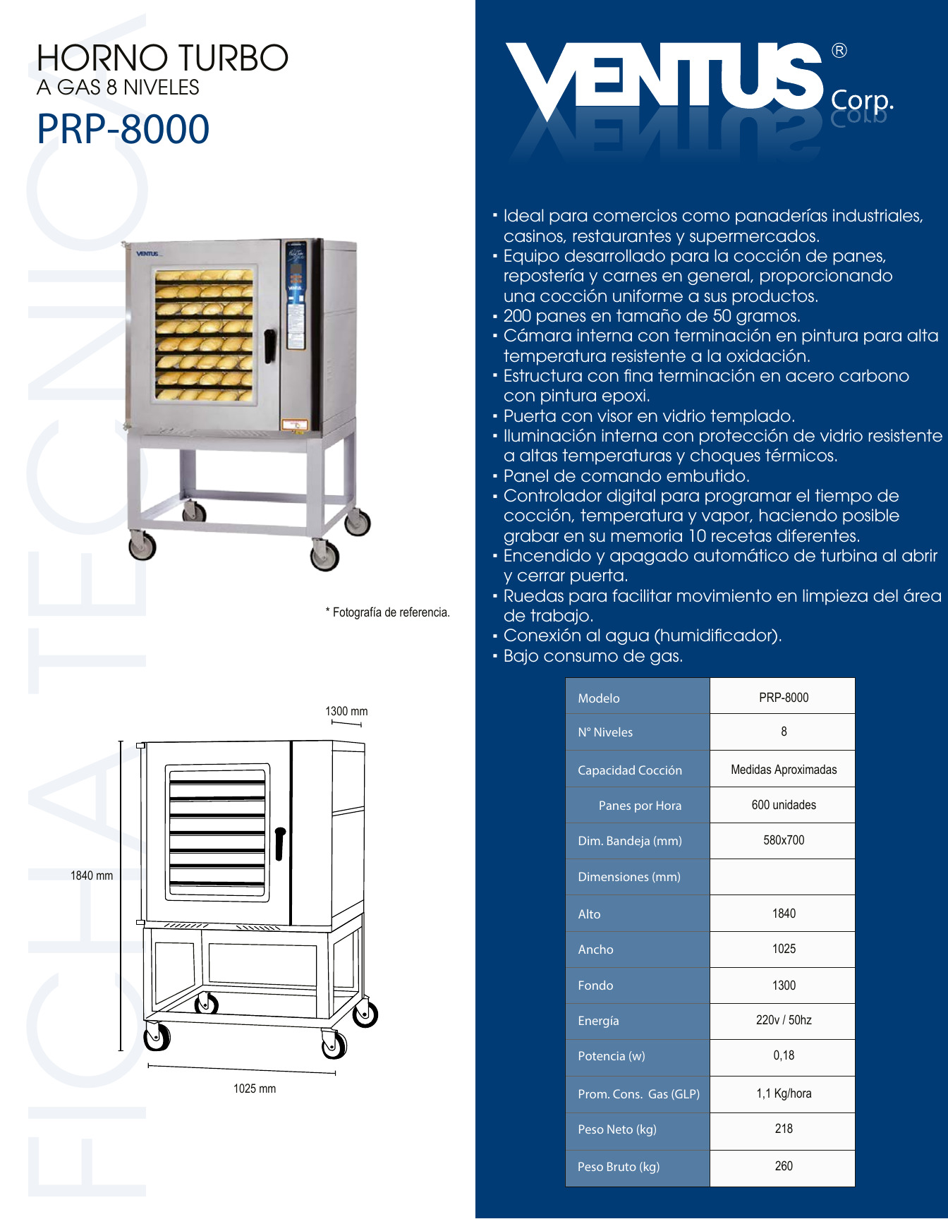 HORNO – > MARCA: VENTUS -> MODELO: PRP-8000 ; realizamos entrega en las ciudades de Lima, Arequipa, Cusco , Moquegua , Tacna , Ica , Chiclayo , Trujillo, Cajamarca, Piura, Tumbes, iquitos, Huancayo , Ayacucho , Pucallpa, Huanuco , Cerro de Pasco ; llevamos mas de 10 años comercializando VENTUS en Peru , somos especialistas importando horno, linea calor , horno turbo a gas, horno a gas de 8 nivelesHorno Turbo a Gas 8 Bandejas PRP-8000