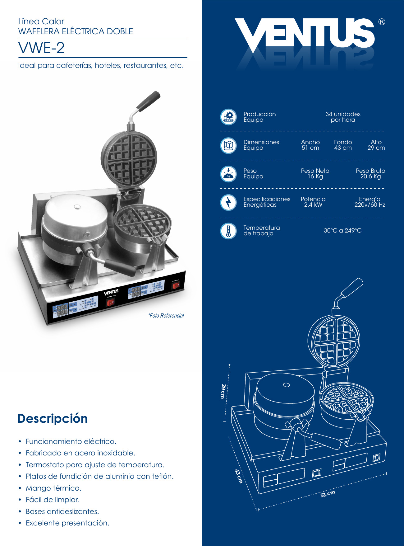 WAFFLERA – > MARCA: VENTUS -> MODELO: VWE-2 ; realizamos entrega en las ciudades de Lima, Arequipa, Cusco , Moquegua , Tacna , Ica , Chiclayo , Trujillo, Cajamarca, Piura, Tumbes, iquitos, Huancayo , Ayacucho , Pucallpa, Huanuco , Cerro de Pasco ; llevamos mas de 10 años comercializando VENTUS en Peru , somos especialistas importando wafflera , linea calor , wafflera electrica , wafflera electrica dobleWafflera electrica doble VWE-2