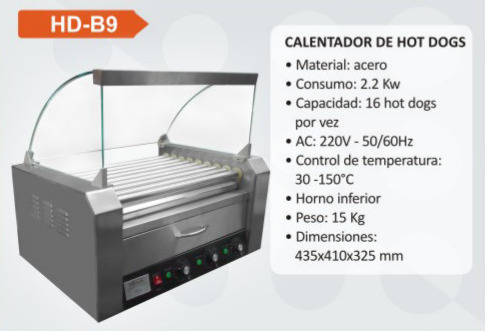 Calentador de Hot Dog de 09 Rodillos – (ROLLER) están diseñadas y construidas de acuerdo a los requerimientos Nacionales. Tienen características de un nuevo estilo, estructura maciza, de fácil operación, haciéndolo un producto eficiente en el ahorro de energía y vida útil más prolongada. Características de fácil operación, diseño razonable para ocupar espacios pequeños. Estos equipos pueden ser combinados con las freidoras eléctricas, panquequeras, Hornos, Cafeteras, Etc.