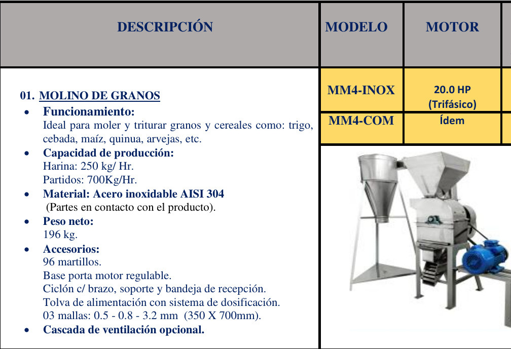 MOLINOS – > MARCA: PERUMINOX -> MODELO: MM4-INOX ; realizamos entrega en las ciudades de Lima, Arequipa, Cusco , Moquegua , Tacna , Ica , Chiclayo , Trujillo, Cajamarca, Piura, Tumbes, iquitos, Huancayo , Ayacucho , Pucallpa, Huanuco , Cerro de Pasco ; llevamos mas de 10 años comercializando PERUMINOX en Peru , somos especialistas importando molinos, maquinas agroindustriales , molino para granos , molino de granos de 250 kg/hMOLINO DE GRANOS MM4-INOX