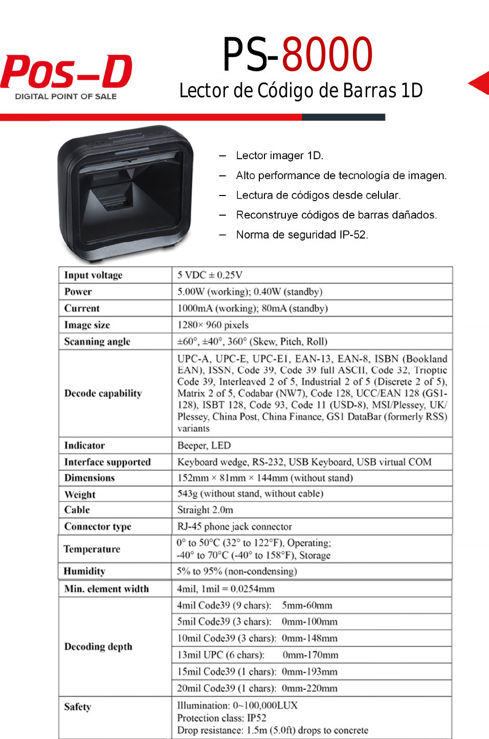El lector PS 8000, le permitirá agilizar los procesos de venta de su negocio, la atención será más fluido debido a la velocidad de lectura de códigos de barras que tiene, además puede reconstruir códigos dañados.