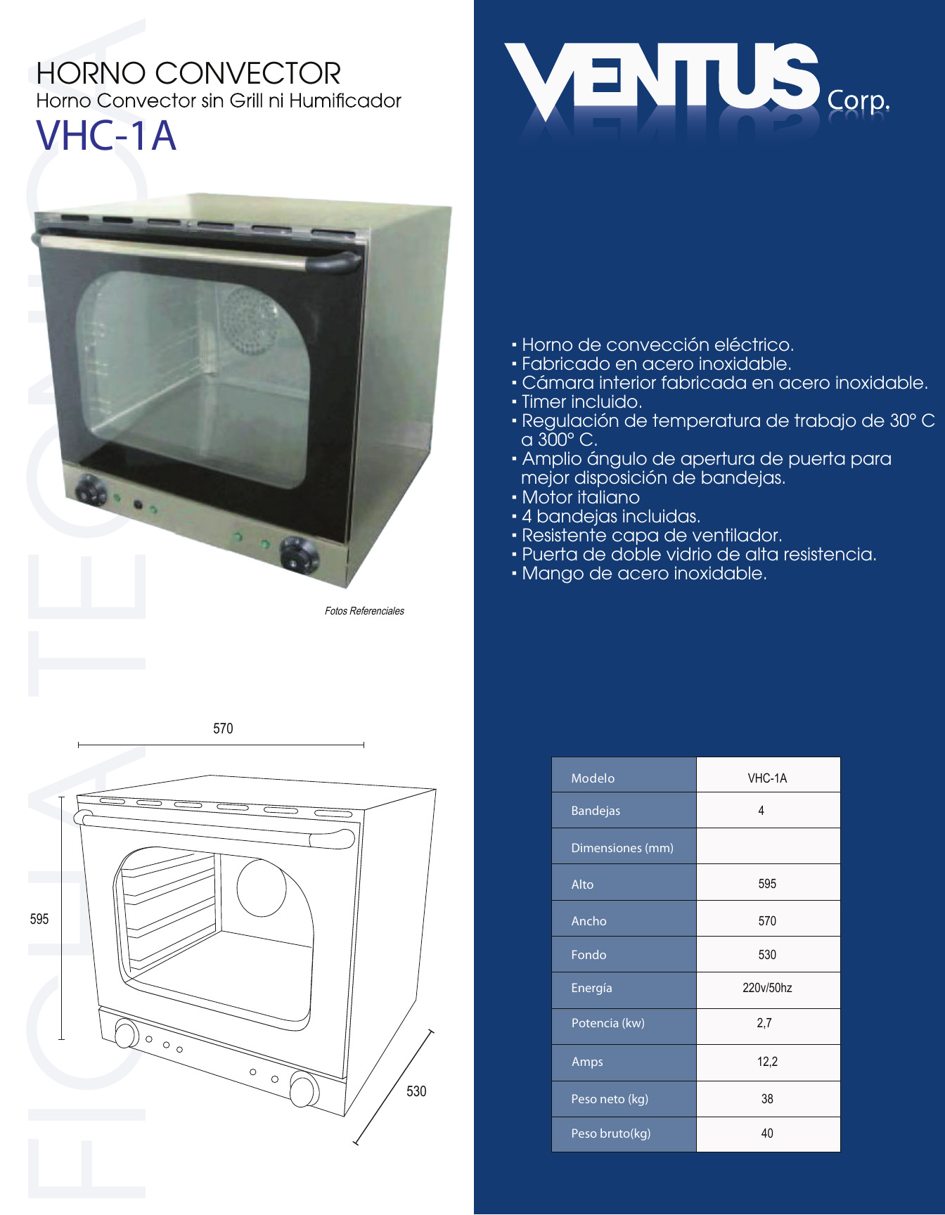 HORNO – > MARCA: VENTUS -> MODELO: VHC-1A ; realizamos entrega en las ciudades de Lima, Arequipa, Cusco , Moquegua , Tacna , Ica , Chiclayo , Trujillo, Cajamarca, Piura, Tumbes, iquitos, Huancayo , Ayacucho , Pucallpa, Huanuco , Cerro de Pasco ; llevamos mas de 10 años comercializando VENTUS en Peru , somos especialistas importando horno, linea calor , horno convector, horno convector de 4 bandejasHorno convector sin grill ni humidificador VHC-1A