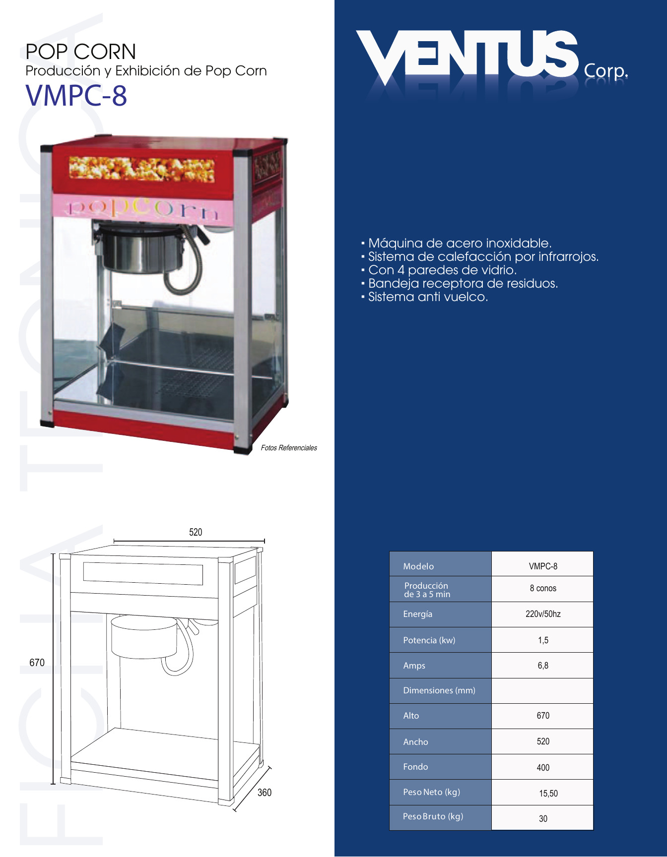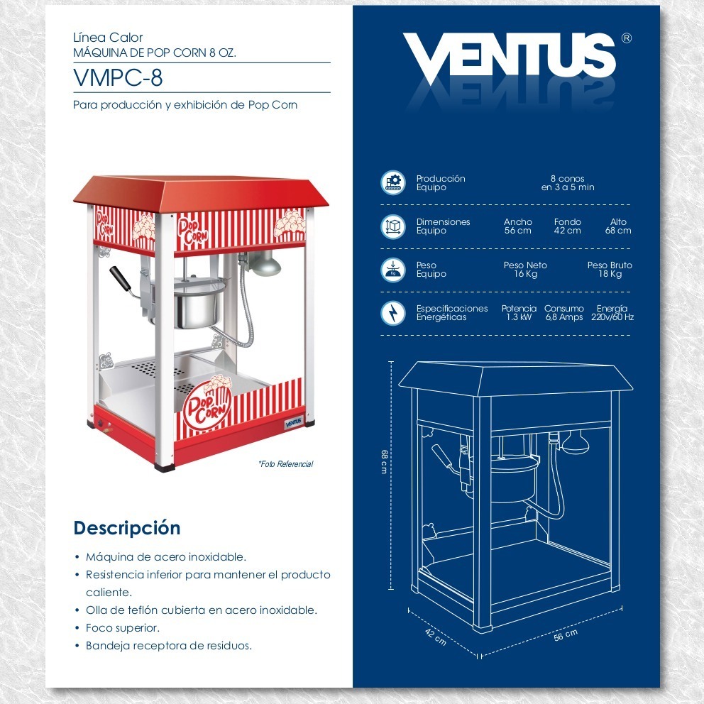 MAQUINA PARA POP CORN – > MARCA: VENTUS -> MODELO: VMPC-8 ; realizamos entrega en las ciudades de Lima, Arequipa, Cusco , Moquegua , Tacna , Ica , Chiclayo , Trujillo, Cajamarca, Piura, Tumbes, iquitos, Huancayo , Ayacucho , Pucallpa, Huanuco , Cerro de Pasco ; llevamos mas de 10 años comercializando VENTUS en Peru , somos especialistas importando maquina para pop corn, linea calor , maquinas para hacer palomitas de maiz , maquina de pop corn de acero inoxidableMaquina pop corn 8oz VMPC-8