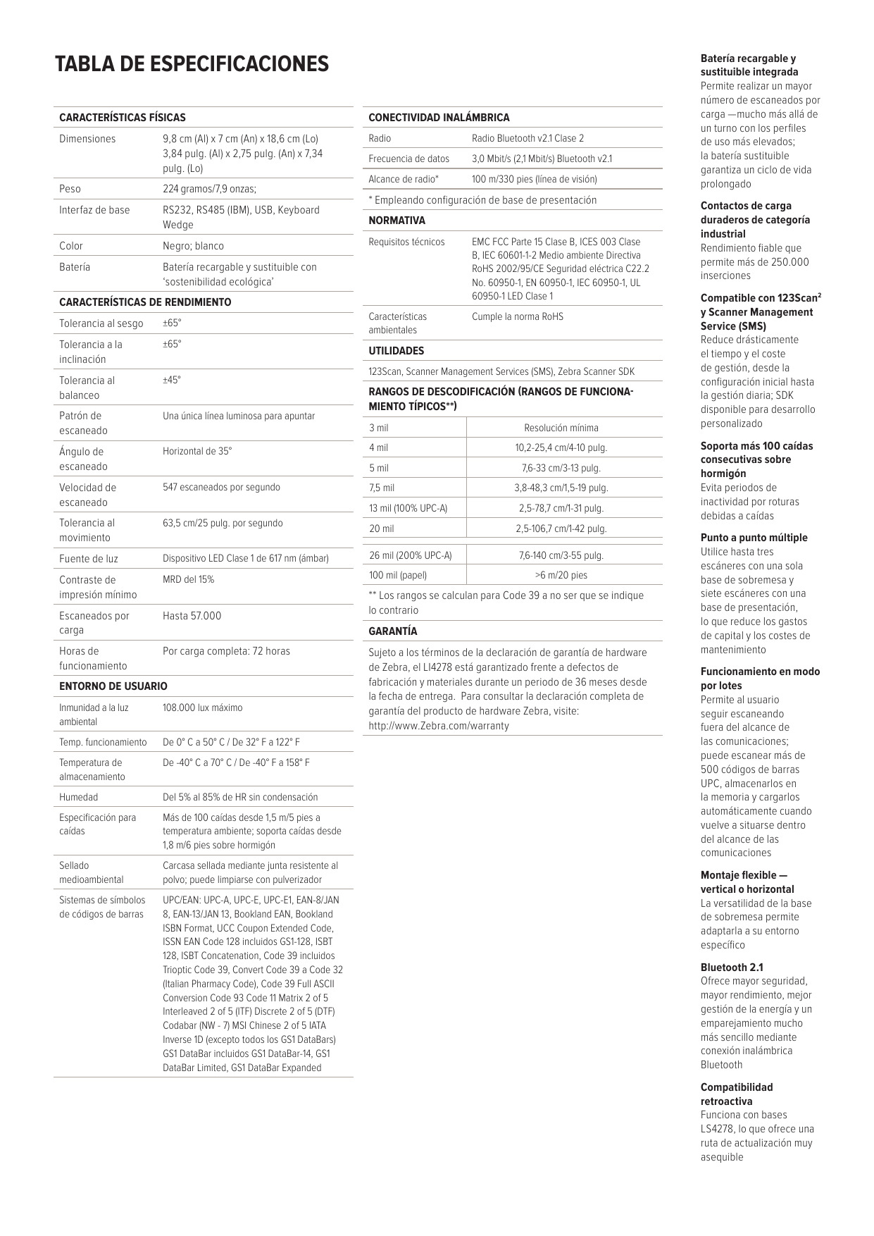 El LI4278 permite a los trabajadores escanear más rápido y más lejos, ya que pueden capturar prácticamente cualquier código de barras 1D, incluidos los códigos de barras impresos en etiquetas de papel, en la pantalla de un teléfono móvil, tableta o computadora. Construido para todo el día y uso diario, el LI4278 ofrece libertad inalámbrica con compatibilidad Bluetooth. También ofrece una mejor encriptación para una mayor seguridad y un mejor rendimiento inalámbrico general. El LI4278 es retrocompatible con su accesorio clave, la cuna, que funciona con sus primos, el LS4278 y el DS6878. La administración superior de energía de la batería ofrece la mayor cantidad de escaneos por carga de batería para admitir aplicaciones de escaneo intensivo Puede usarlo en ambientes polvorientos y húmedos y puede sobrevivir a una caída de 6 pies / 1.8 metros.